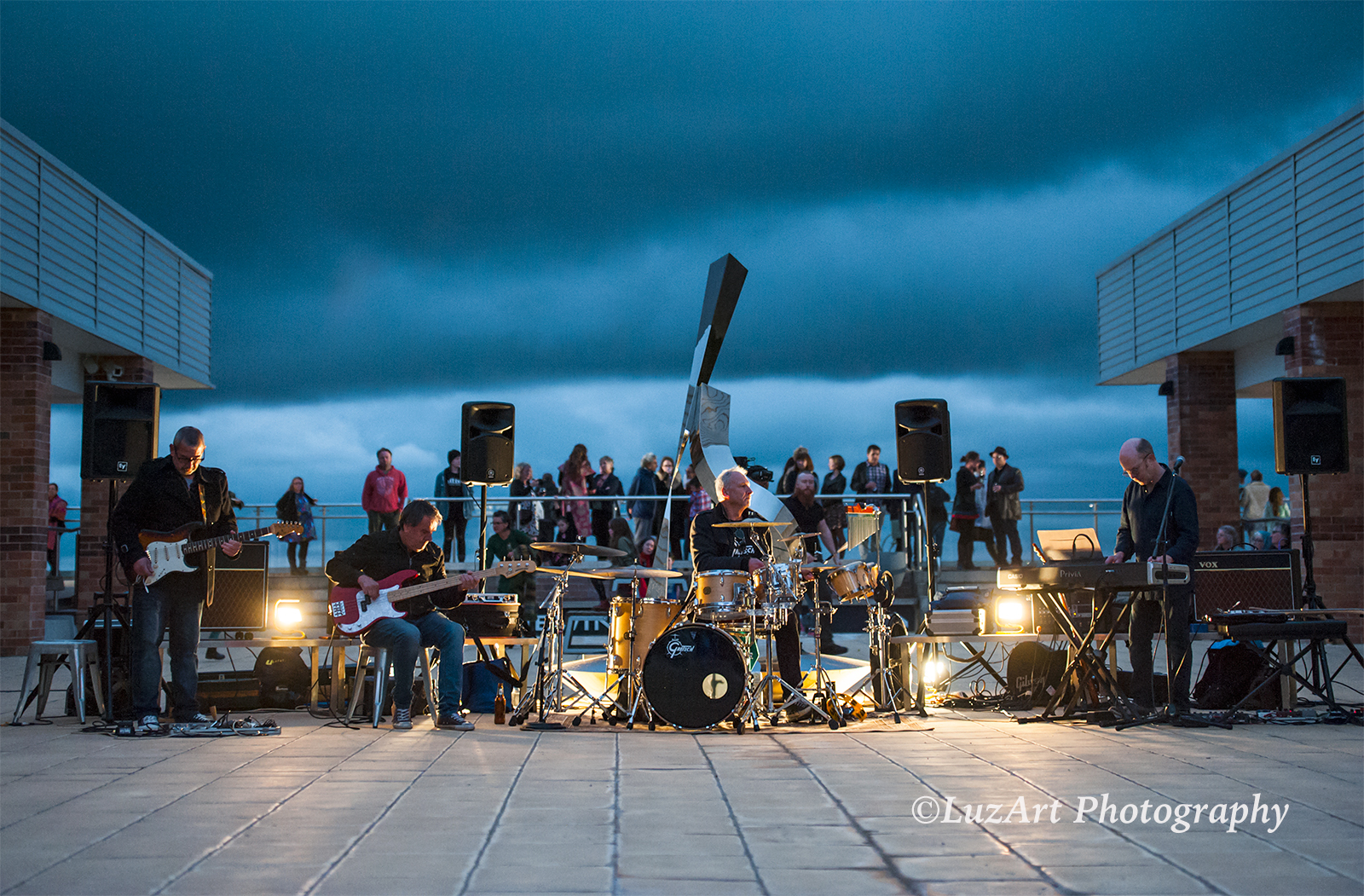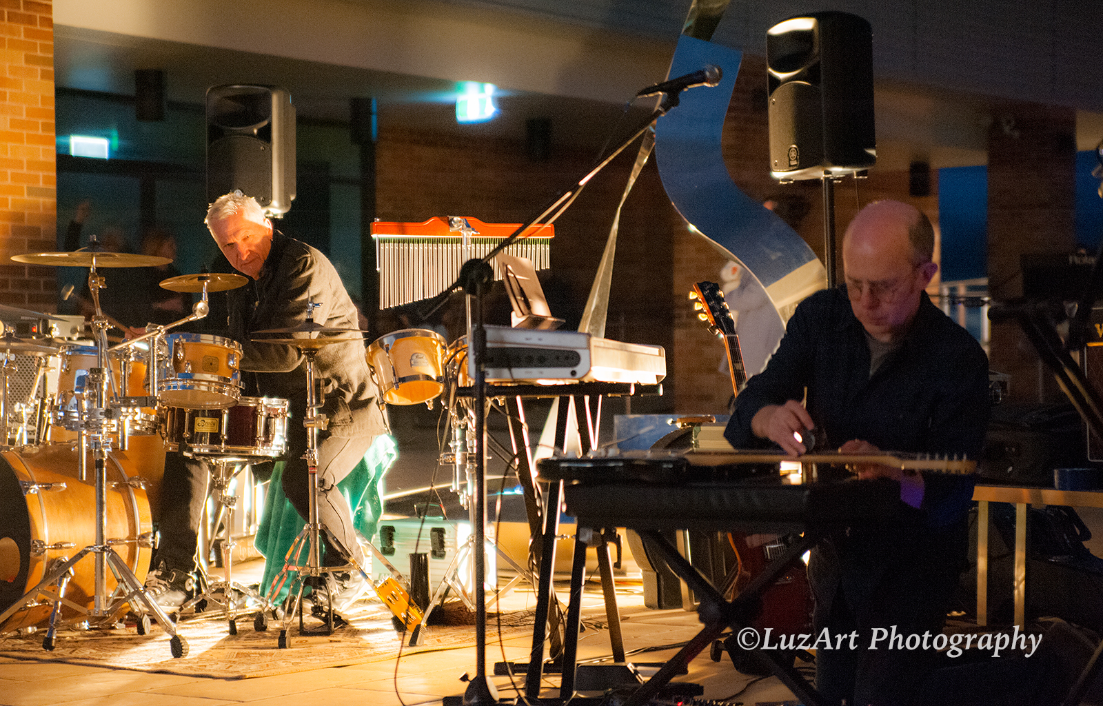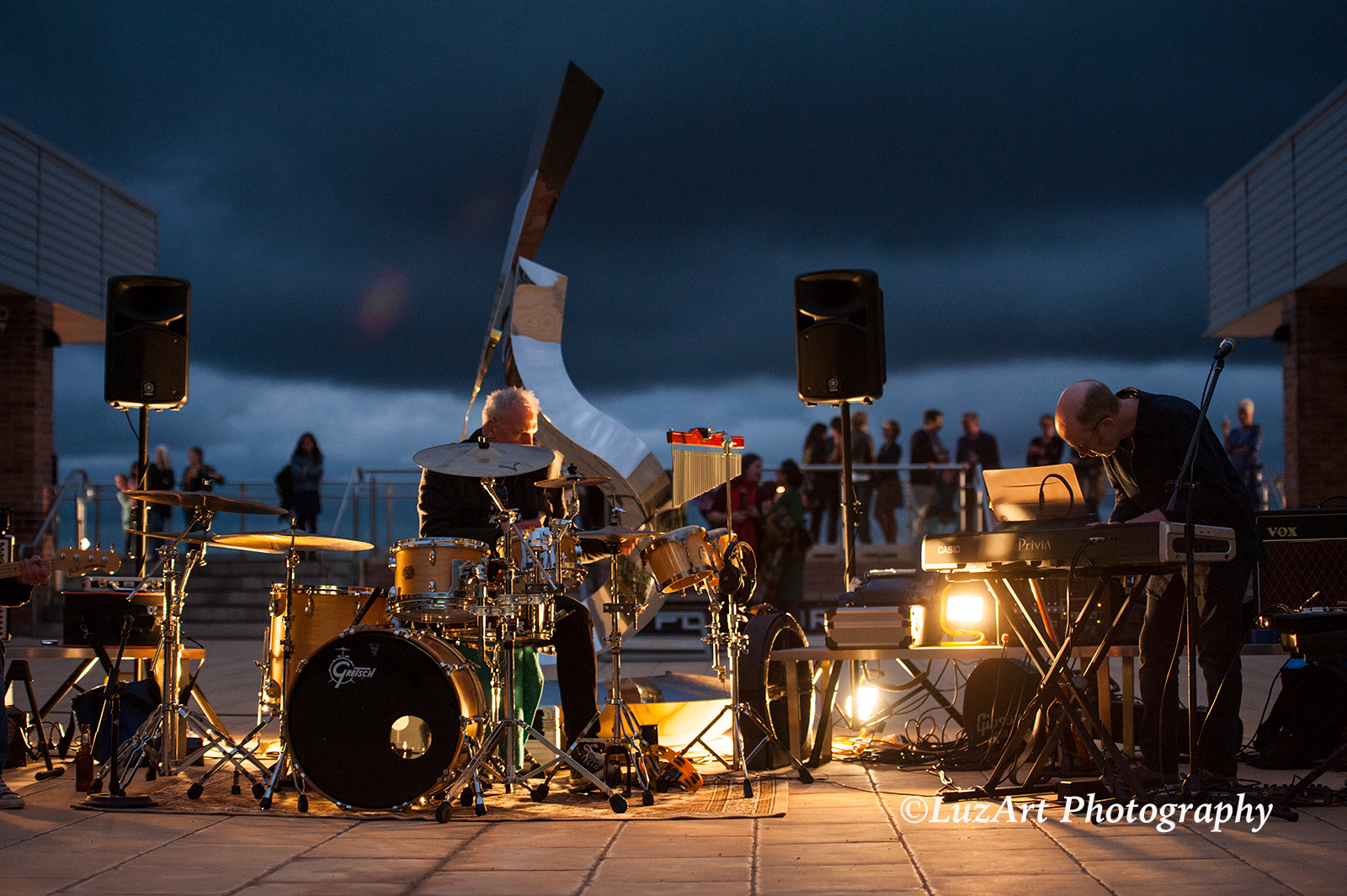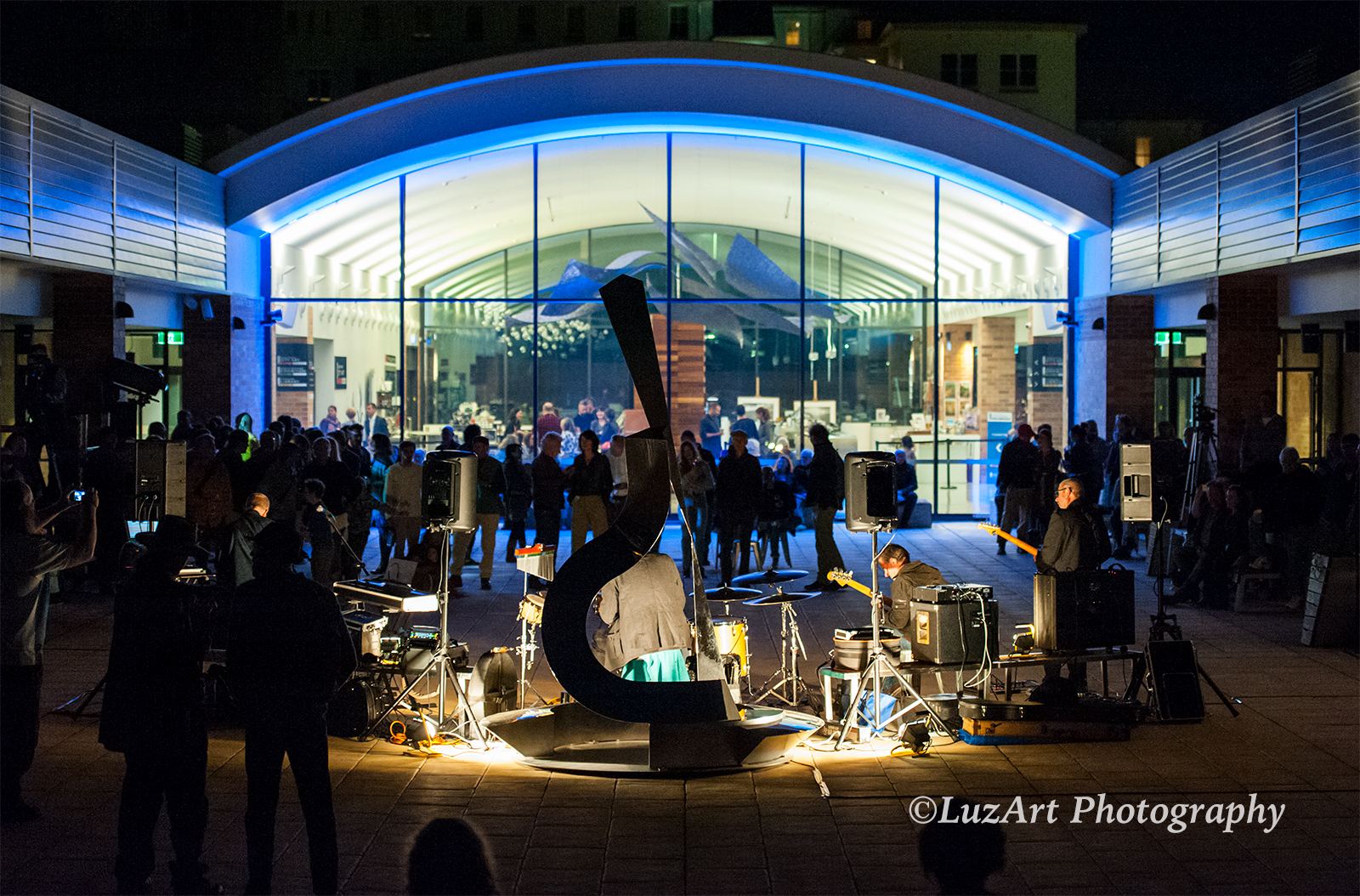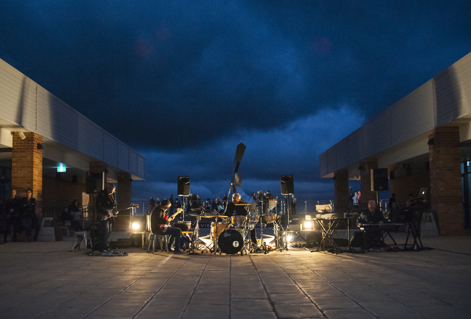 Music performed by improvisation group PaperSun integrates harmonically and rhythmically with the echoed acoustic surrounds of the courtyard. This provides a compelling auditory backdrop to the gradually changing light conditions for audience members, especially those located beneath the archway or 'suspension' zone, augmented by projections of abstracted imagery. The large window facing the courtyard area contributes to the acoustic character of the space, offering dual properties of reflection and transparency and providing optimal views of liminal zones emerging as daylight transitions from twilight into evening.